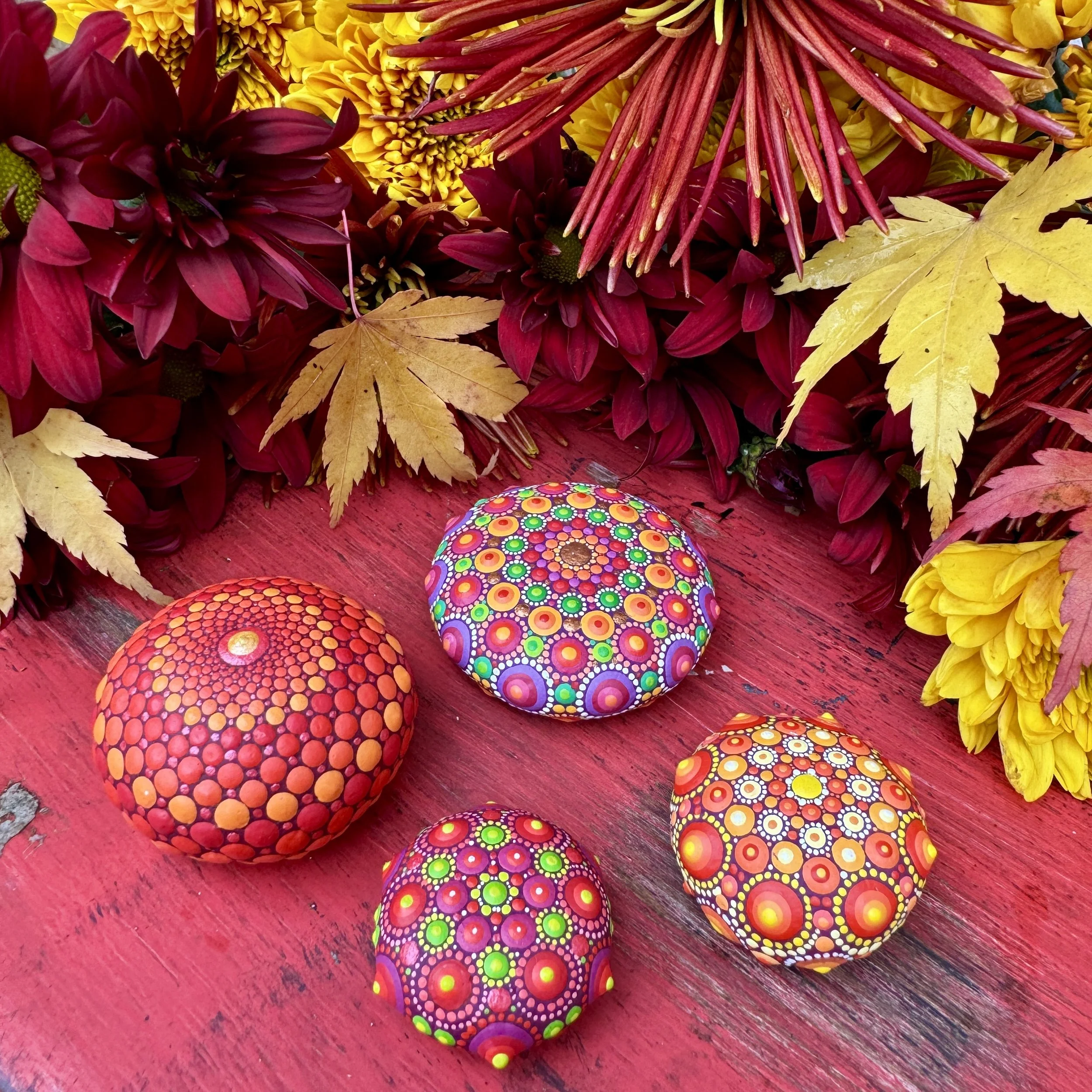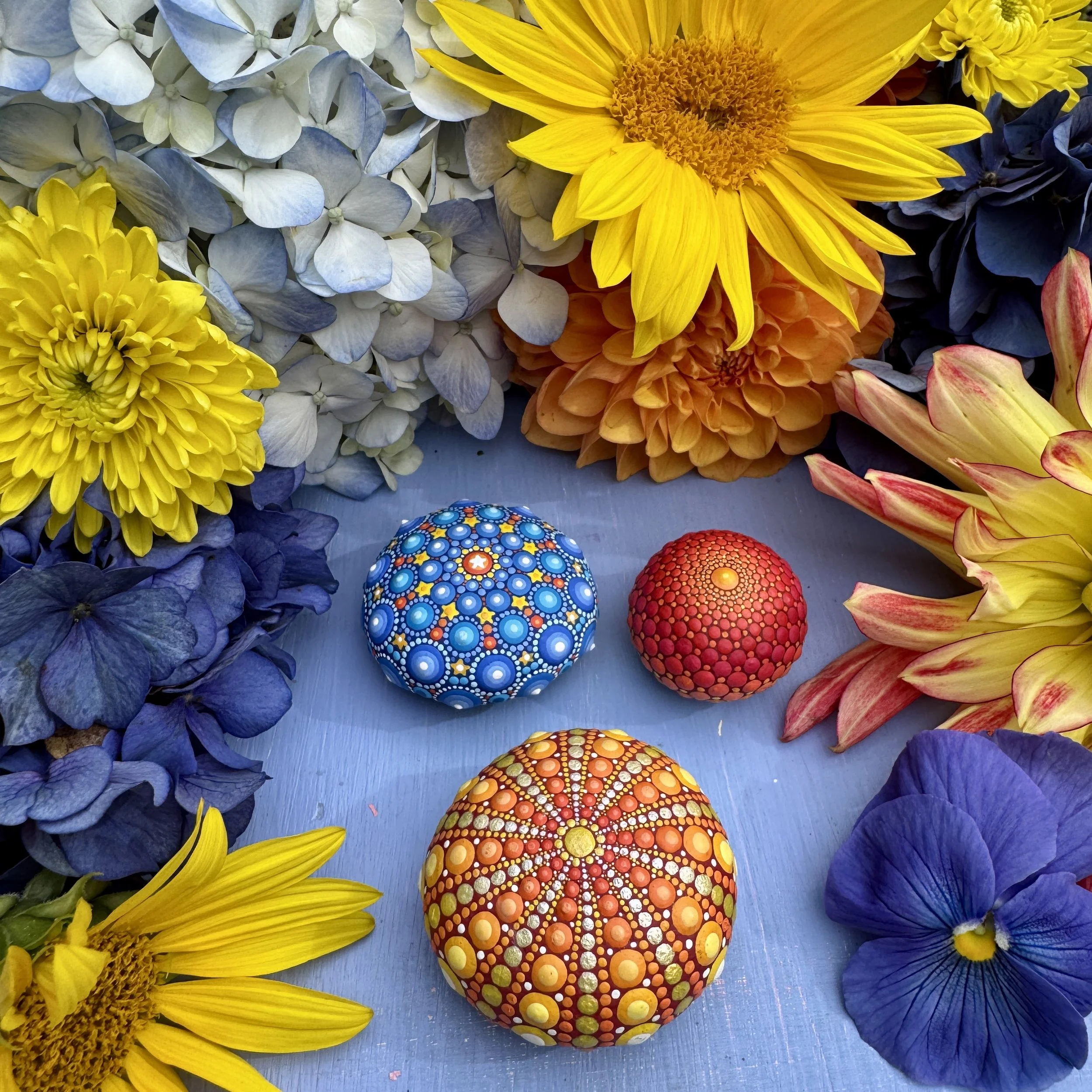 I had taken some of my mini mandala paintings to photograph them against the grey backdrop of ocean stones. While there, I discovered a few perfectly round stones. They intrigued me, and an idea began to flourish. The mini mandala paintings I held in one hand and the round stones in the other merged together in my mind and inspired me to create something new. At that moment, the idea was born.
